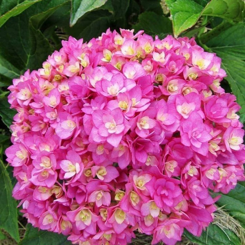 Цвітіння багато протягом усього сезону. Суцвіття щільні, великі, до 20 см у діаметрі, зібрані з яскраво-рожевих та світло-блакитних або фіолетових квіток залежно від кислотного складу ґрунту.