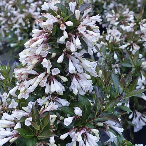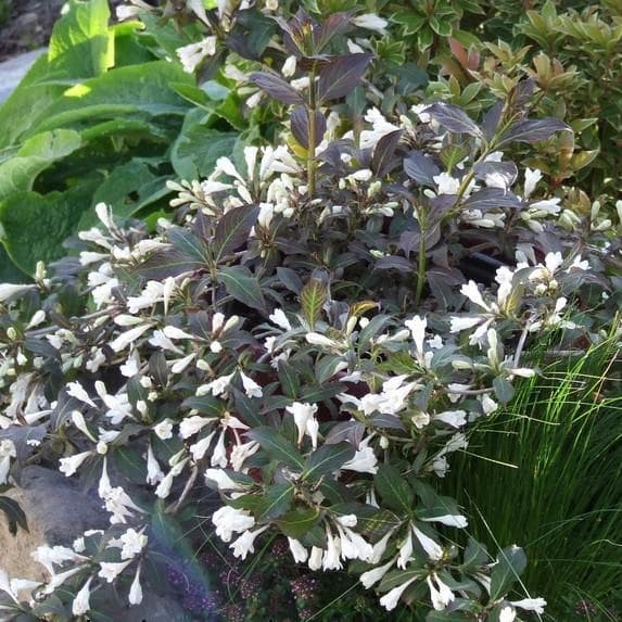 Вейгела цветущая Блэк энд Вайт - широко используется в ландшафтном озеленении территорий, популярный многолетний декоративный кустарник с компактной округлой, хорошо облиственной кроной диаметром до 40 см растение. Относится к медленно-растущим сортам растение вырастает высотой 50 - 60см. Цветение очень обильное с первой декады июня, многочисленные колокольчики, белой окраски, с бордовой внутренней частью. Листья эллиптической формы, темно-зеленой окраски, со временем приобретают пурпурный оттенок.